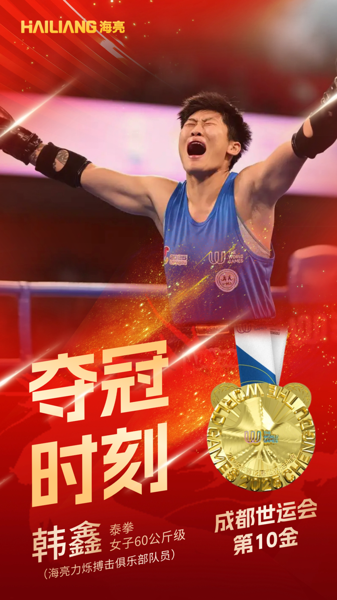 8月10日,2025年第12届世界运动会迎来了第三个比赛日,其中泰拳女子60公斤级决赛在四川省体育馆举行,来自海亮力烁搏击俱乐部的中国运动员韩鑫在开局不利的情况下,最终以29:28的比分逆转击败土耳其运动员KOCAKUS Kubra夺得冠军,为中国体育代表团再添一金,也是海亮集团为国家输送的第一个体育类世界冠军。
